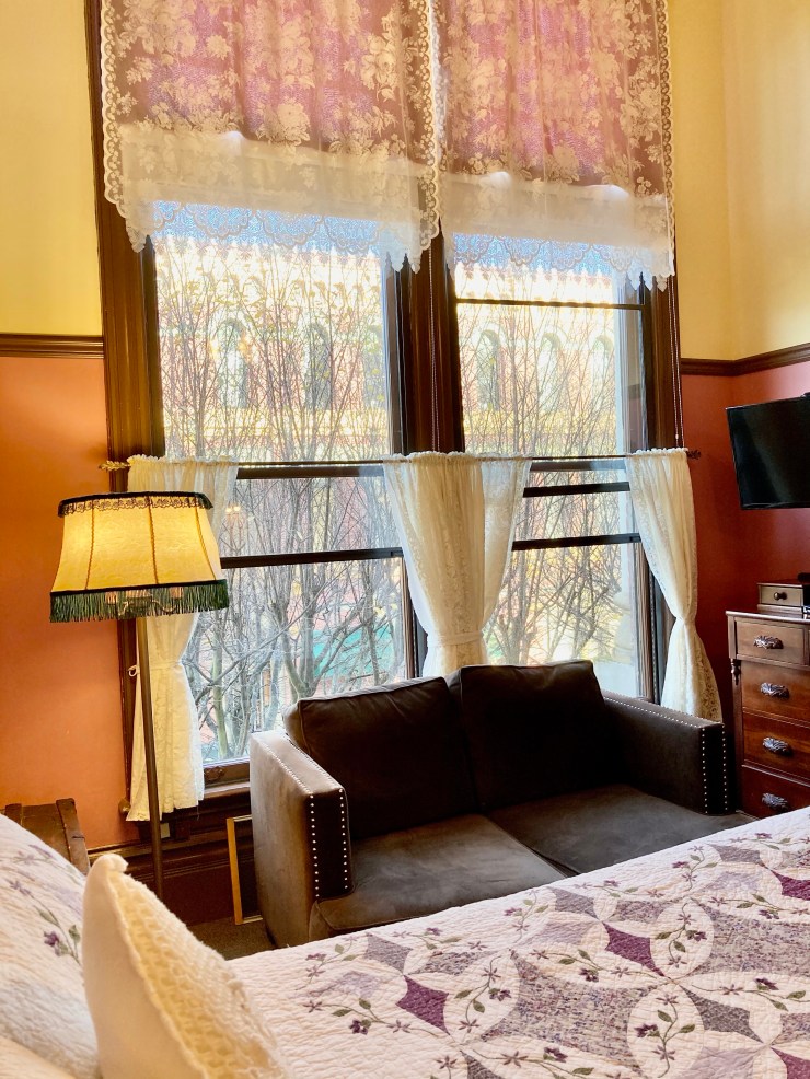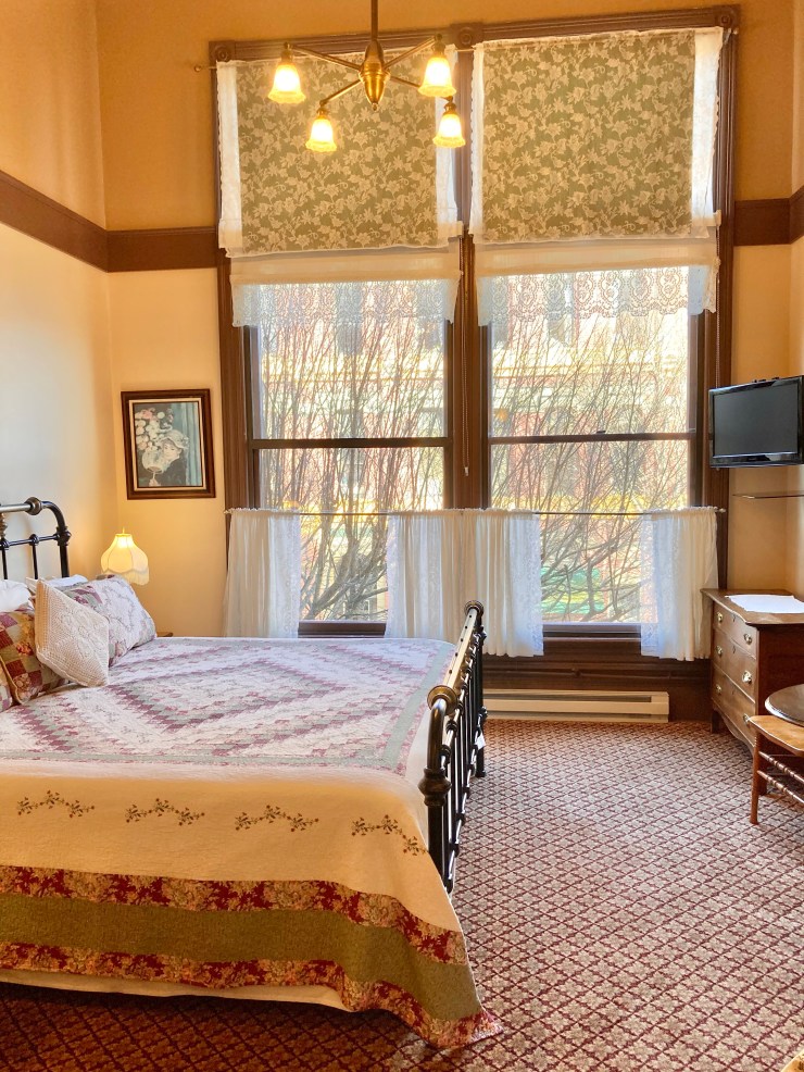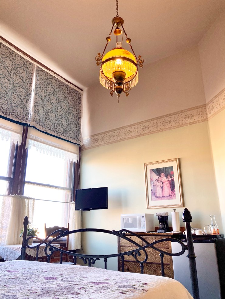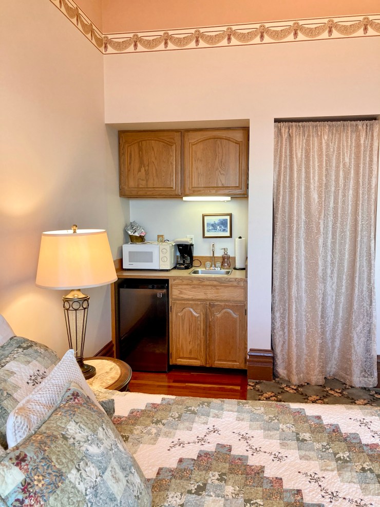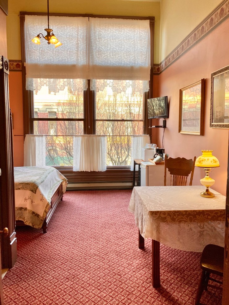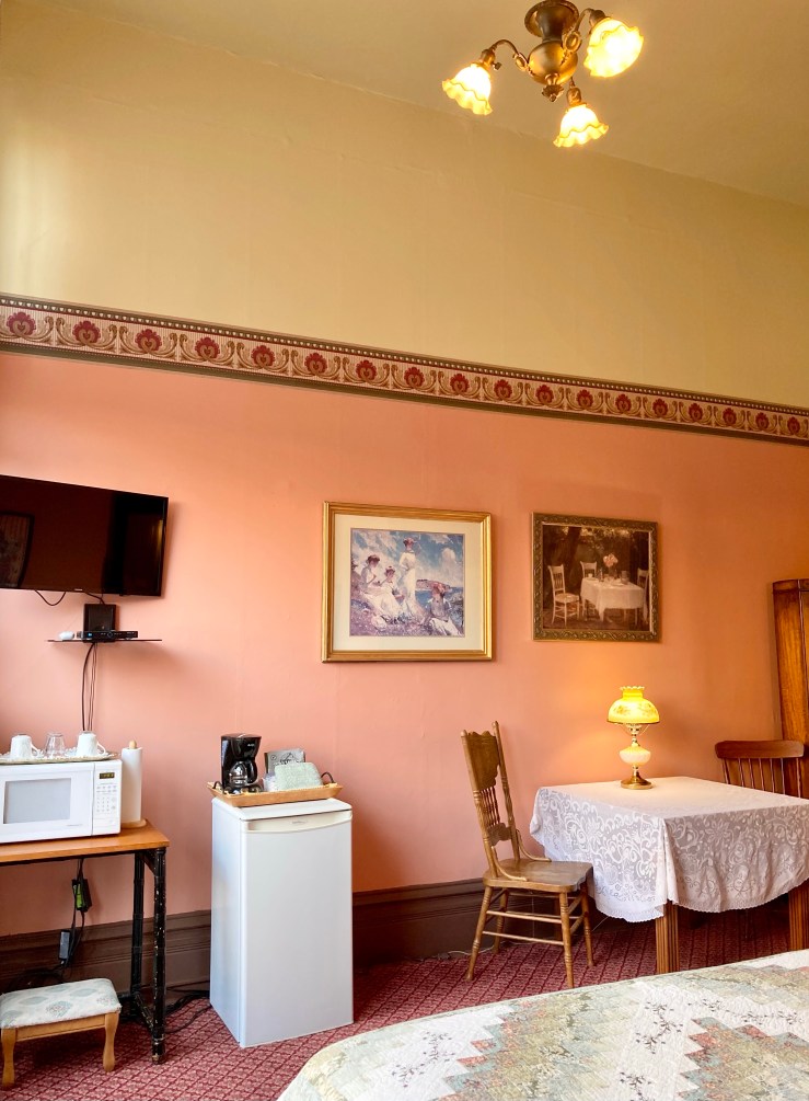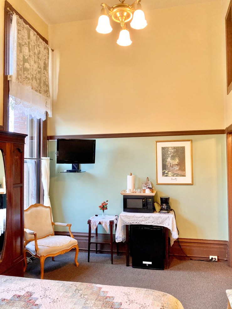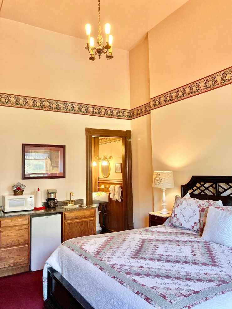 Room 6A: Deluxe Room. 2nd Floor. Historic Street View + Historic Bell Tower View. Queen Bed. Full Bath. Partial Kitchen (full fridge, sink, microwave – no stove). Victorian Ambiance.