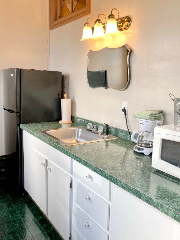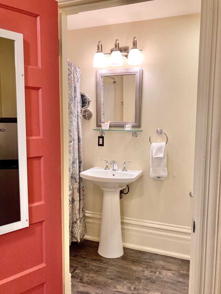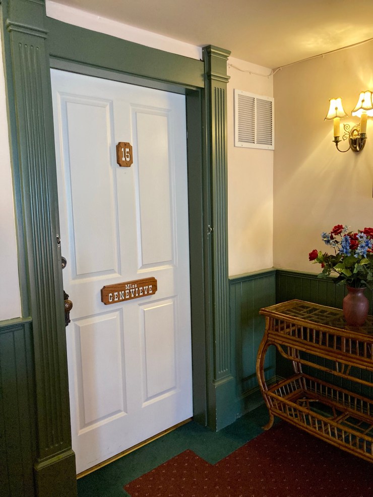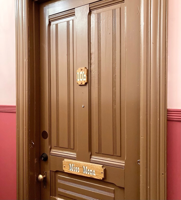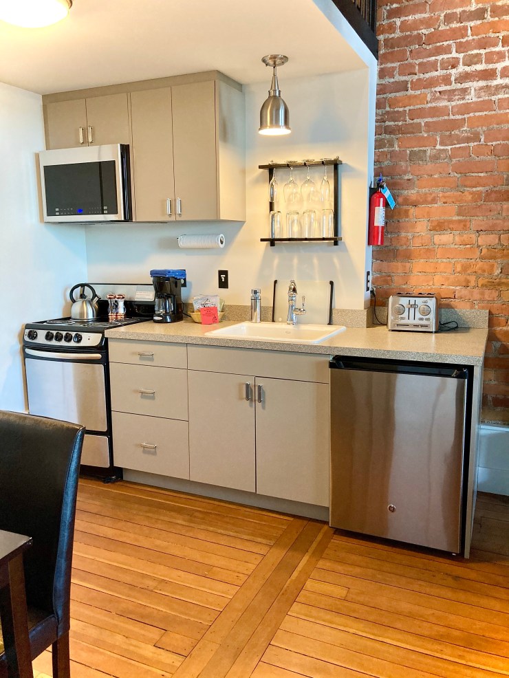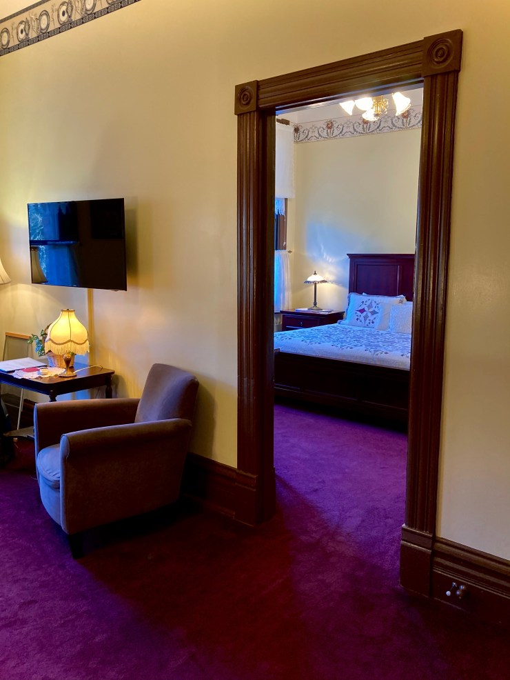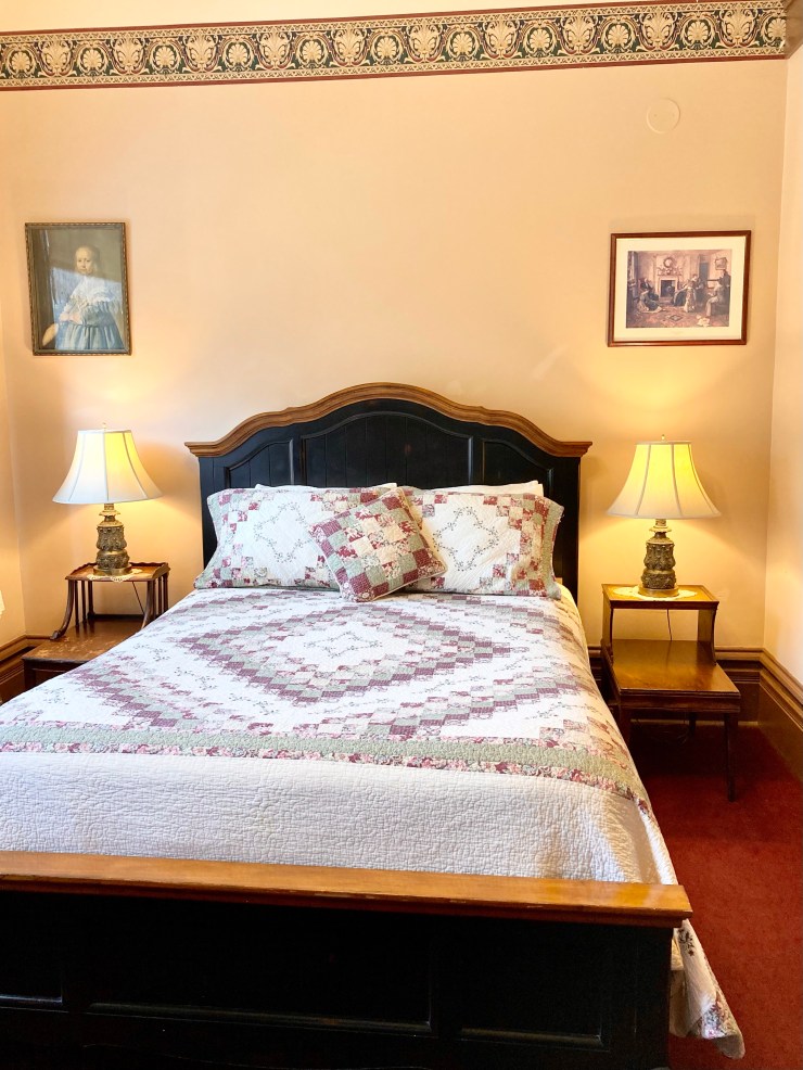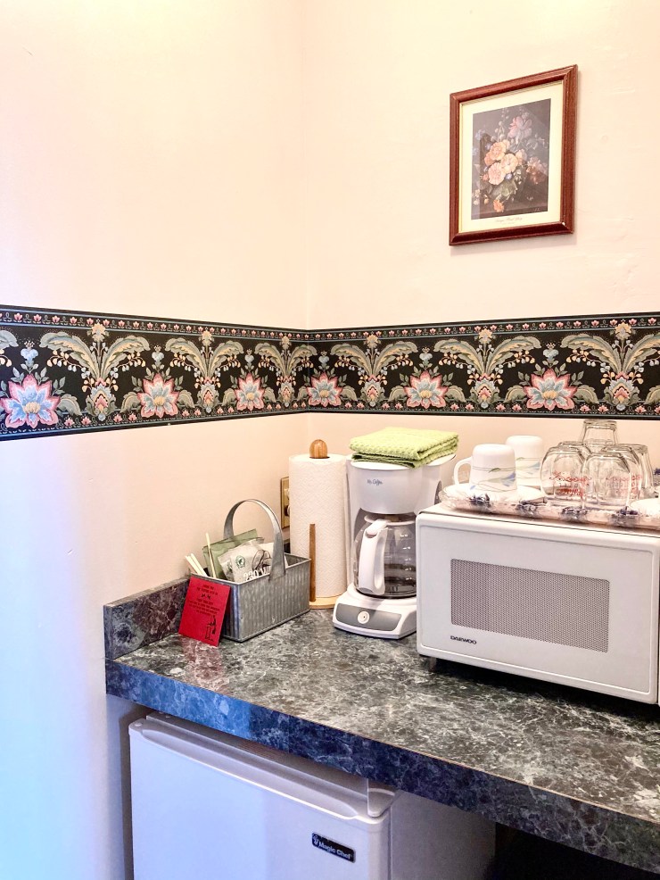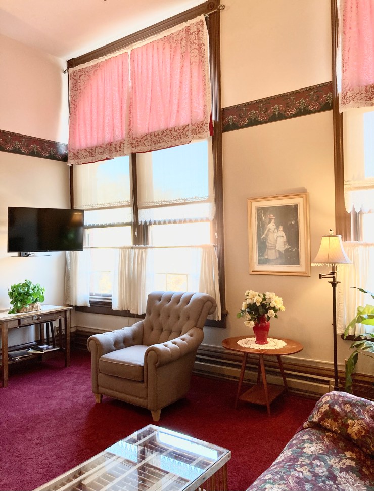 Room 6A: Deluxe Room. 2nd Floor. Historic Street View + Historic Bell Tower View. Queen Bed. Full Bath. Partial Kitchen (full fridge, sink, microwave – no stove). Victorian Ambiance.