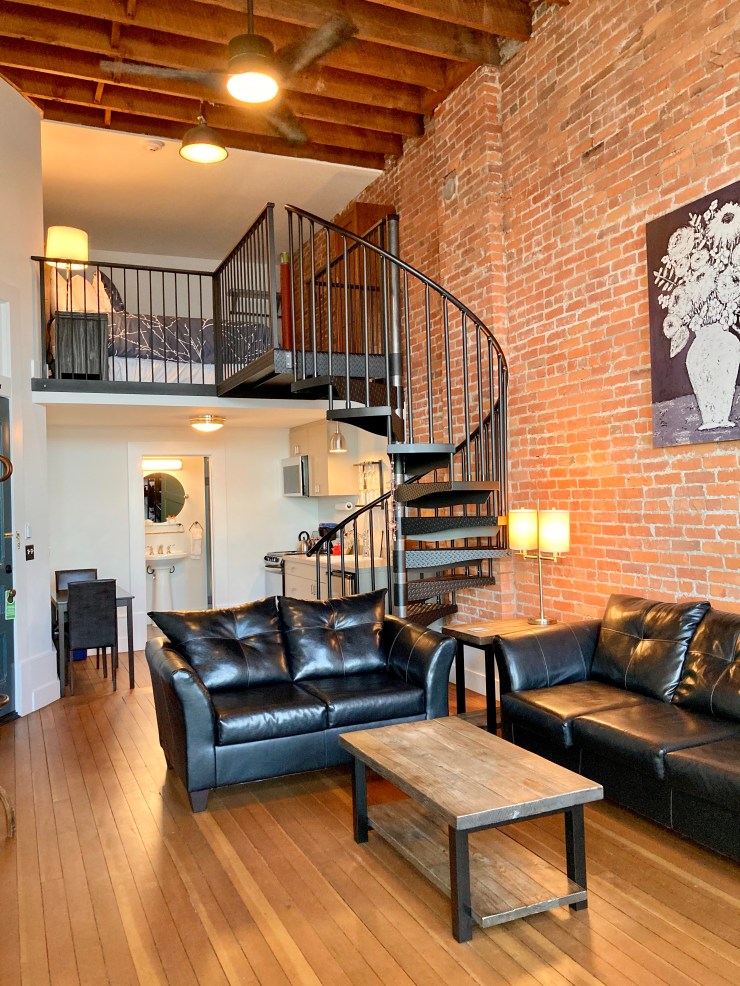 Room 33: Lofted Studio. 3rd Floor. Historic Bell Tower View. King Bed. Spiral Stairs to Lofted Sleeping Area. TV Downstairs. Full Bath. Full Kitchen. Modern Decor. Will accommodate 4 people with air bed.