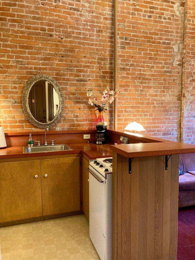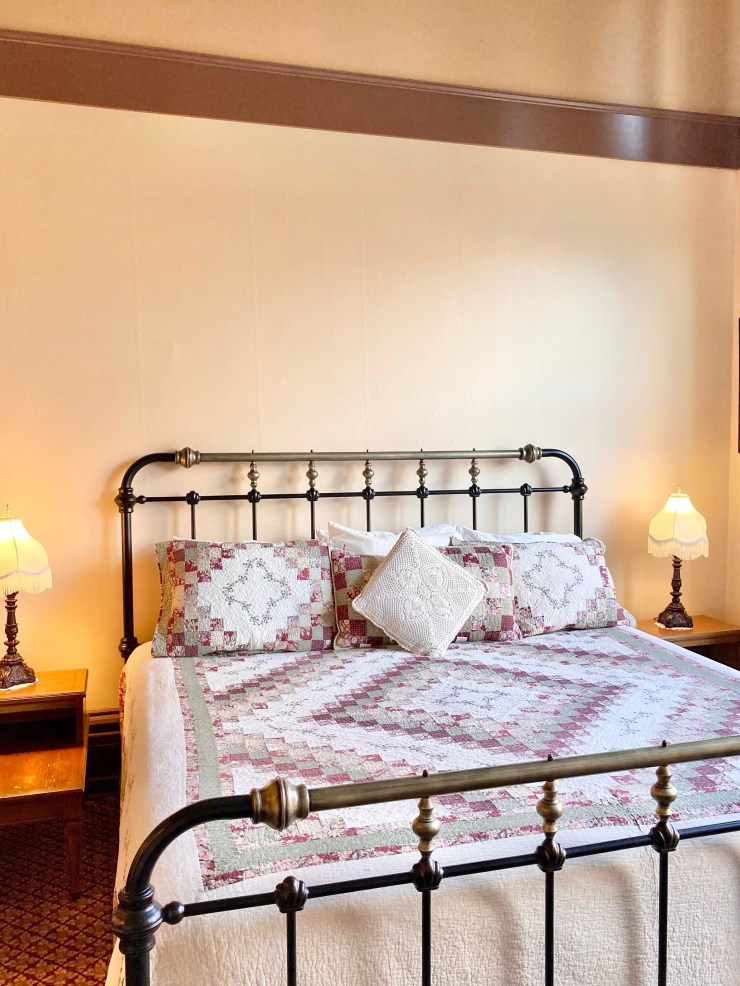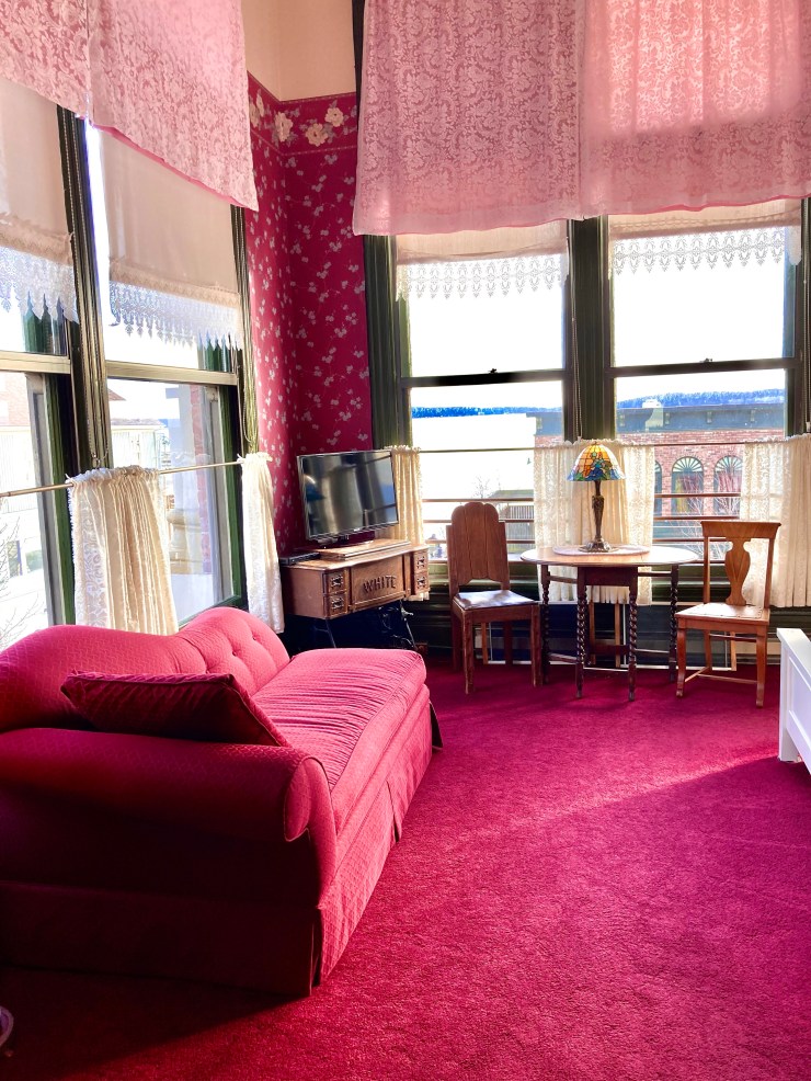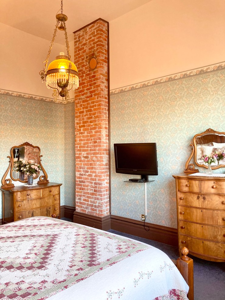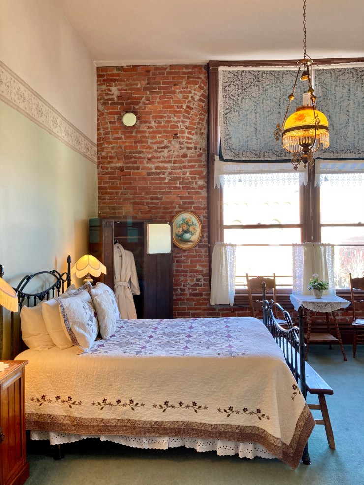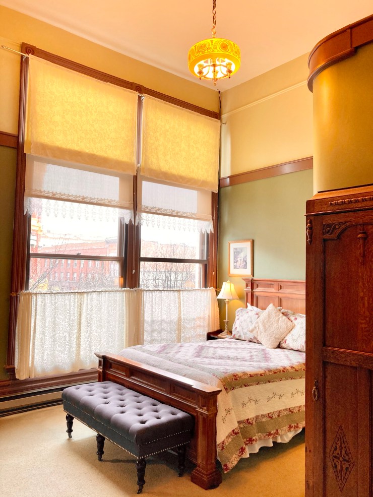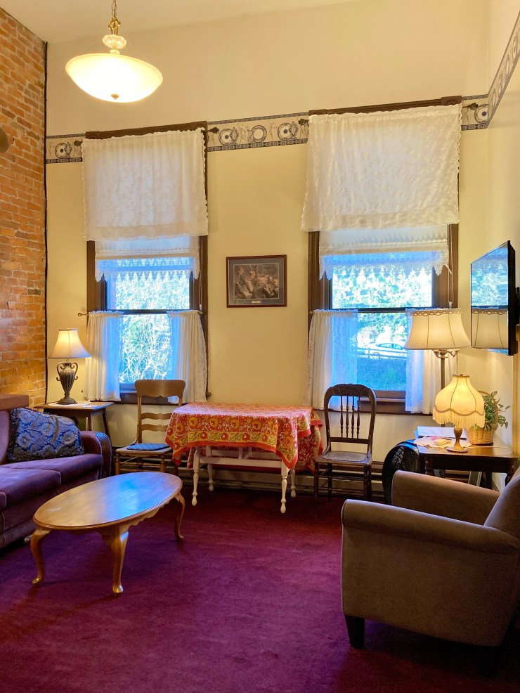 There are 26 rooms at the Palace Hotel, each is unique in layout, amenities and decor. 19 rooms are decorated with antique furnishings and have Victorian ambiance. 7 rooms are decorated in a modern “loft” style. Many rooms have full kitchens. Some rooms accommodate 4 people with two queen beds, others with an added air bed. See details below including photos of each room. Note that bedding and furniture may be different than what’s pictured here as we are likely to make changes and upgrades. With this in mind, the photos will still give you a good idea of the individual room layout, views and style.