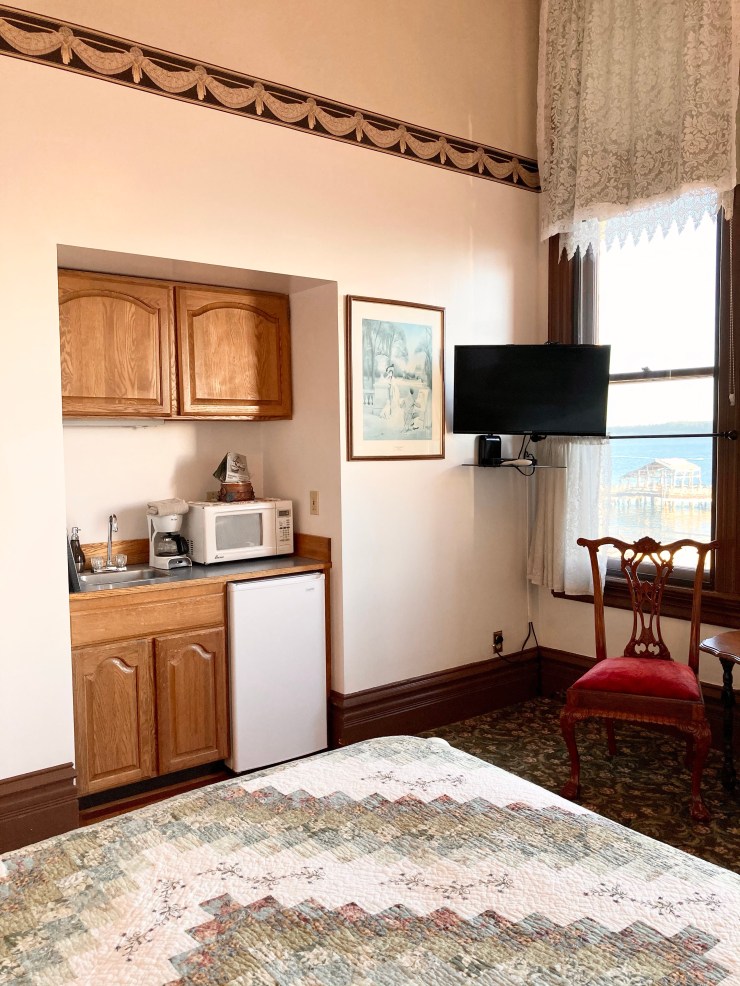 Room 14: Premium Room. 3rd Floor. Water View. King Bed. Full Bath. Mini Fridge. Microwave. Victorian Ambiance.