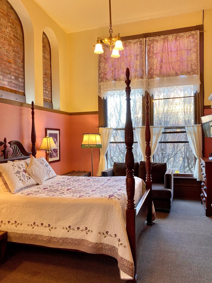 Room 7: Superior Room. 2nd Floor. Historic Bell Tower View. King Bed. Full Bath. Clawfoot Tub. Mini Fridge. Microwave. Victorian Ambiance.