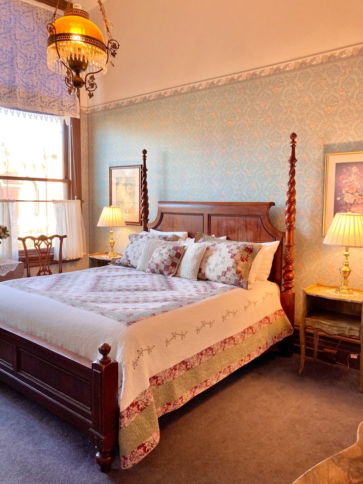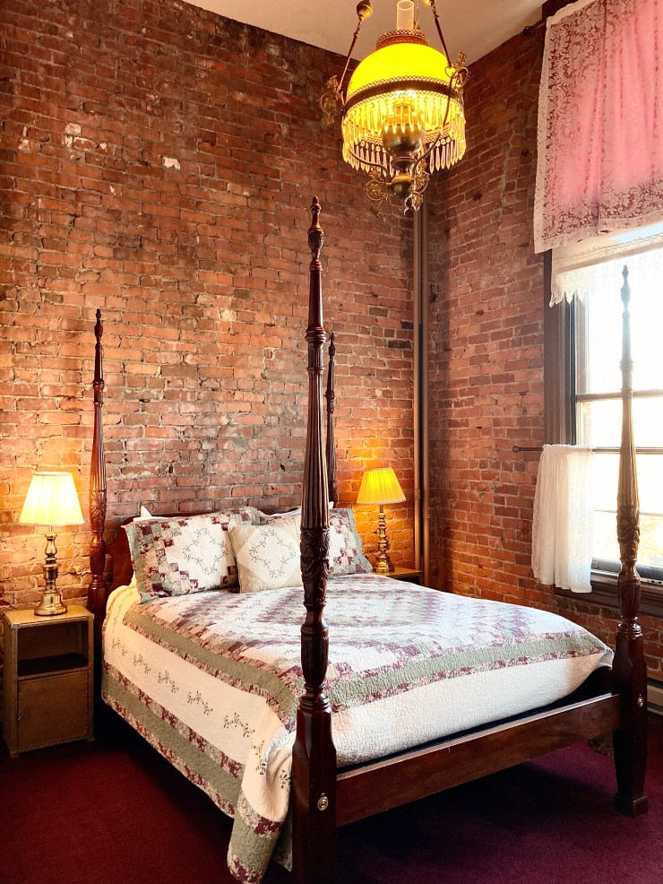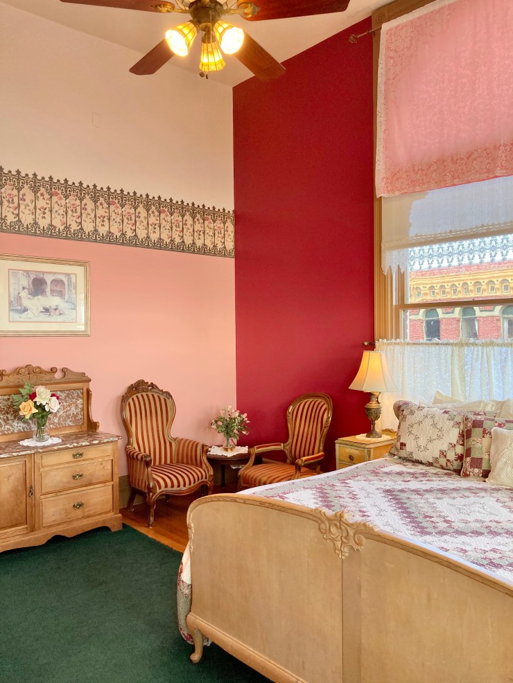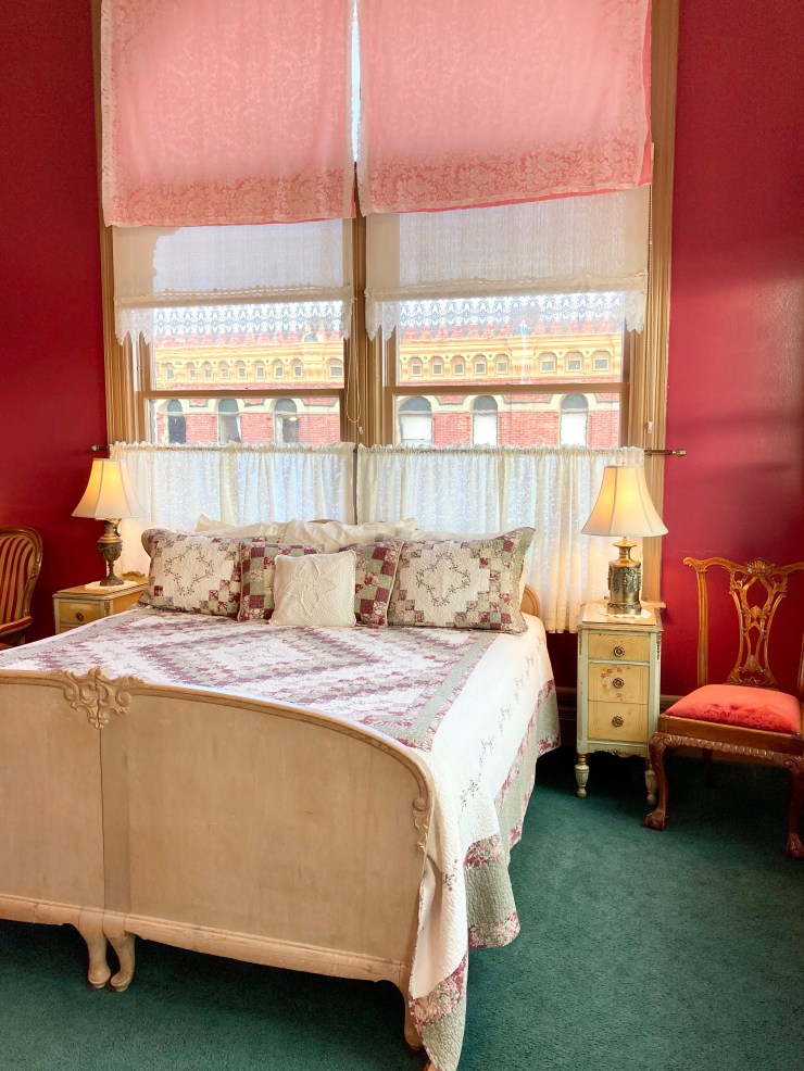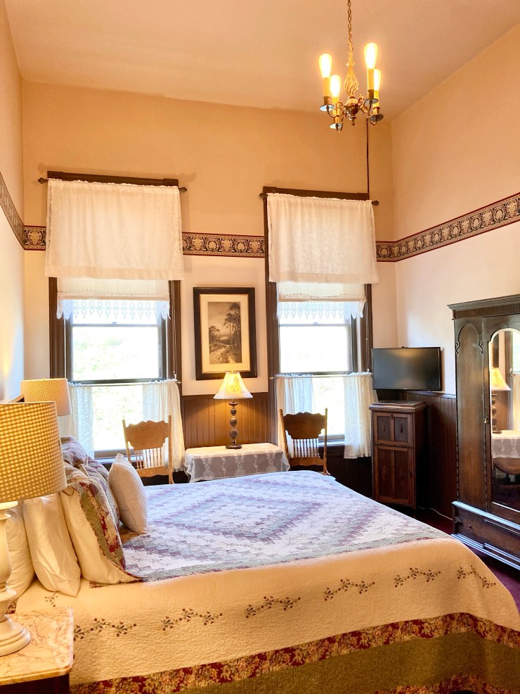 Room 4: Deluxe Room. 2nd Floor. Historic Street View. Queen Bed. Shower Only. Mini Fridge. Microwave. Victorian Ambiance.