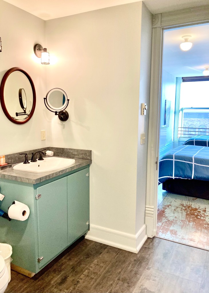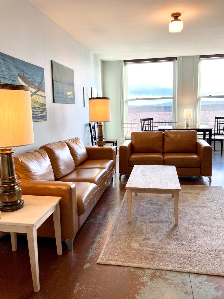 Room 31: View Lofted Studio. 3rd Floor. Water View. King Bed. Spiral Stairs to Lofted Sleeping Area. TV Downstairs. Full Bath. Full Kitchen. Modern Decor. Will accommodate 4 people with air bed.