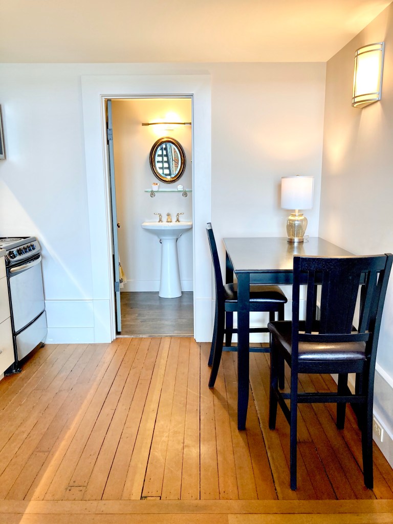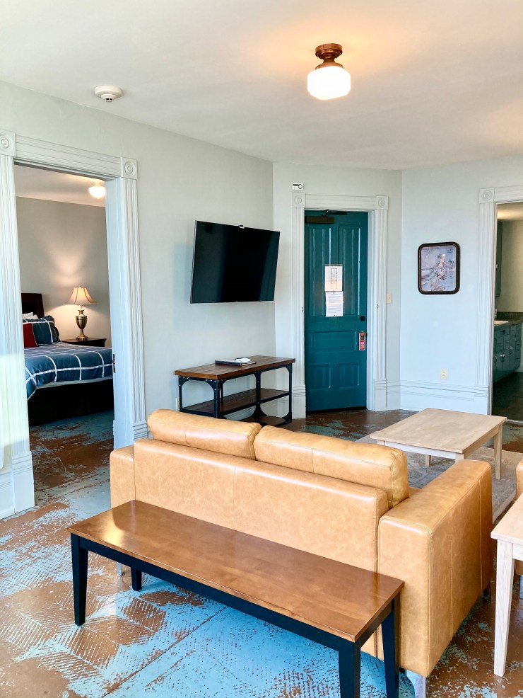 Room 9: Apartment. 3rd Floor. Partial-Water View. Queen Bed. Separate Bedroom. TV in Living Room. Full Bath. Full Kitchen. Victorian Ambiance.