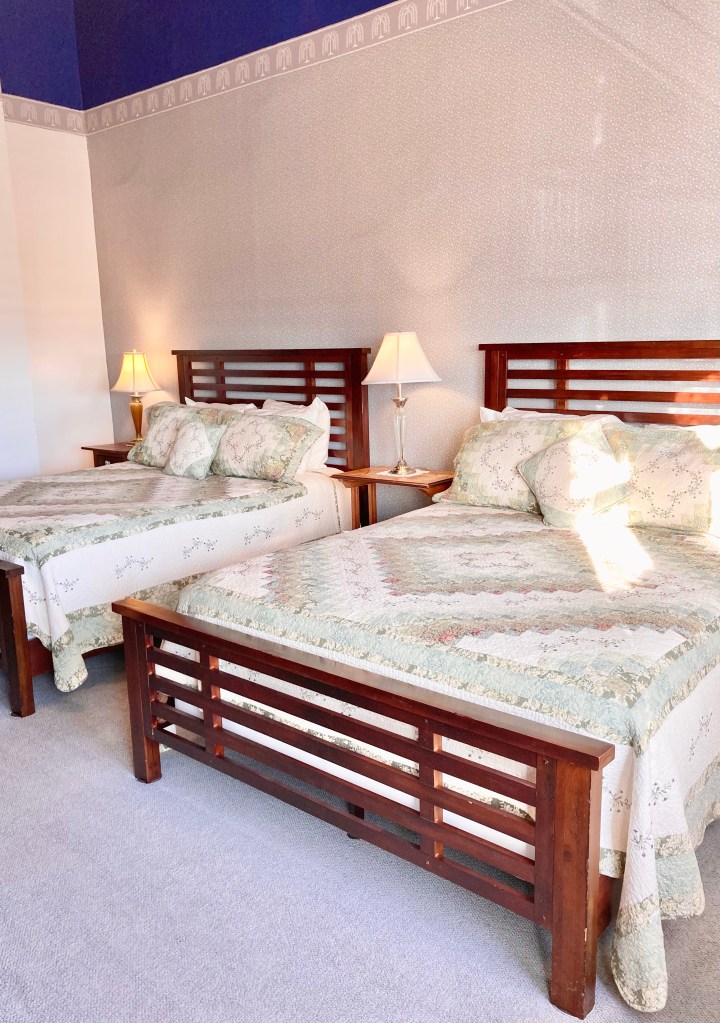 Room 2: Two Queens. 2nd Floor. Partial-Water View. 2 Queen Beds. Full Bath. Mini Fridge. Microwave. Victorian Ambiance.