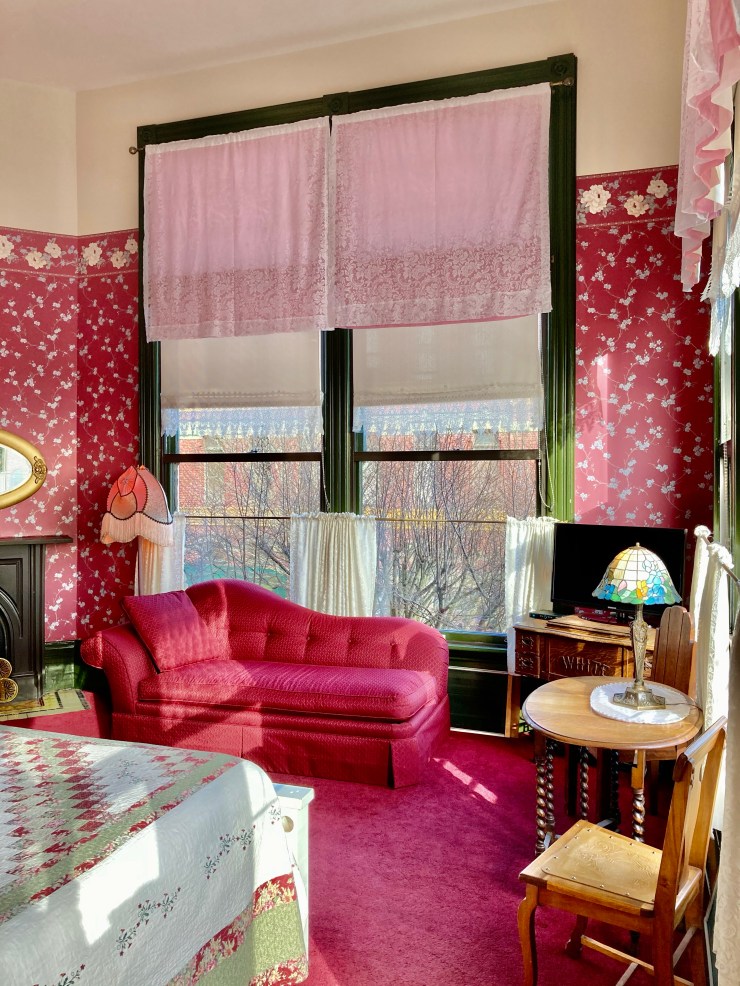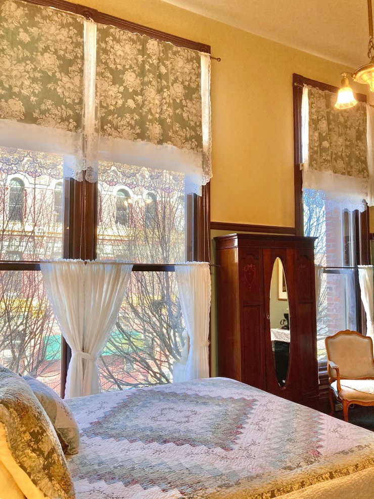 Room 5A: Superior Room. 2nd Floor. Historic Street View. King Bed. Full Bath. Clawfoot Tub. Mini Fridge. Microwave. Victorian Ambiance.