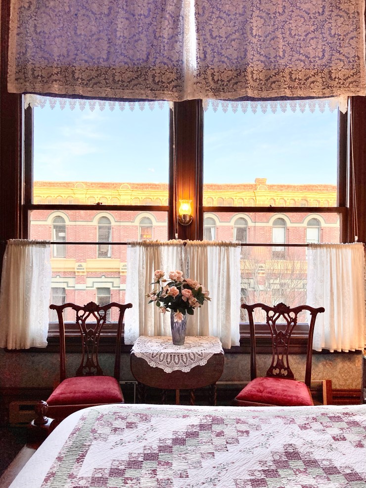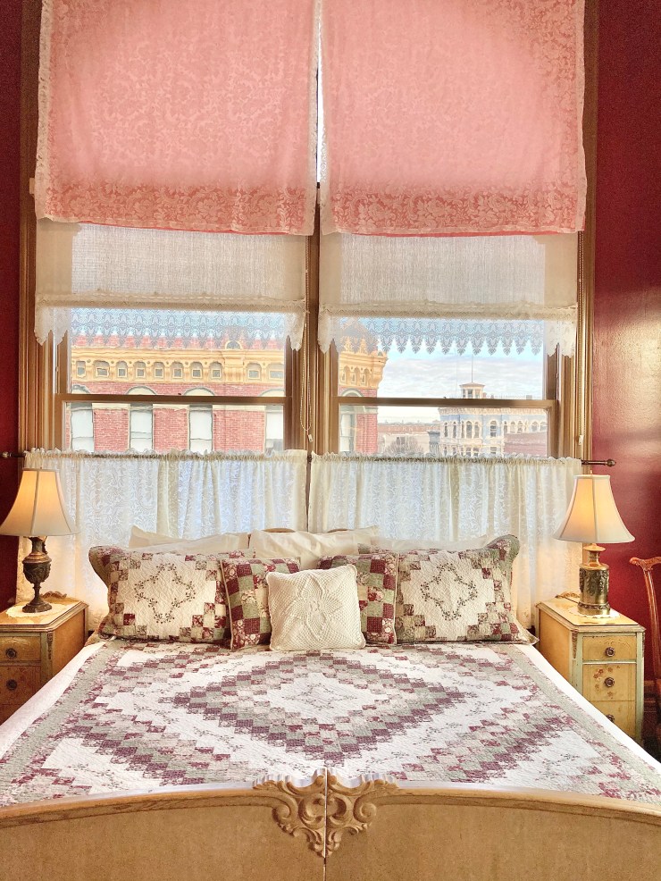 Room 6B: Deluxe Room. 2nd Floor. Historic Street View. Queen Bed. Full Bath. Clawfoot Tub. Mini Fridge. Microwave. Victorian Ambiance.