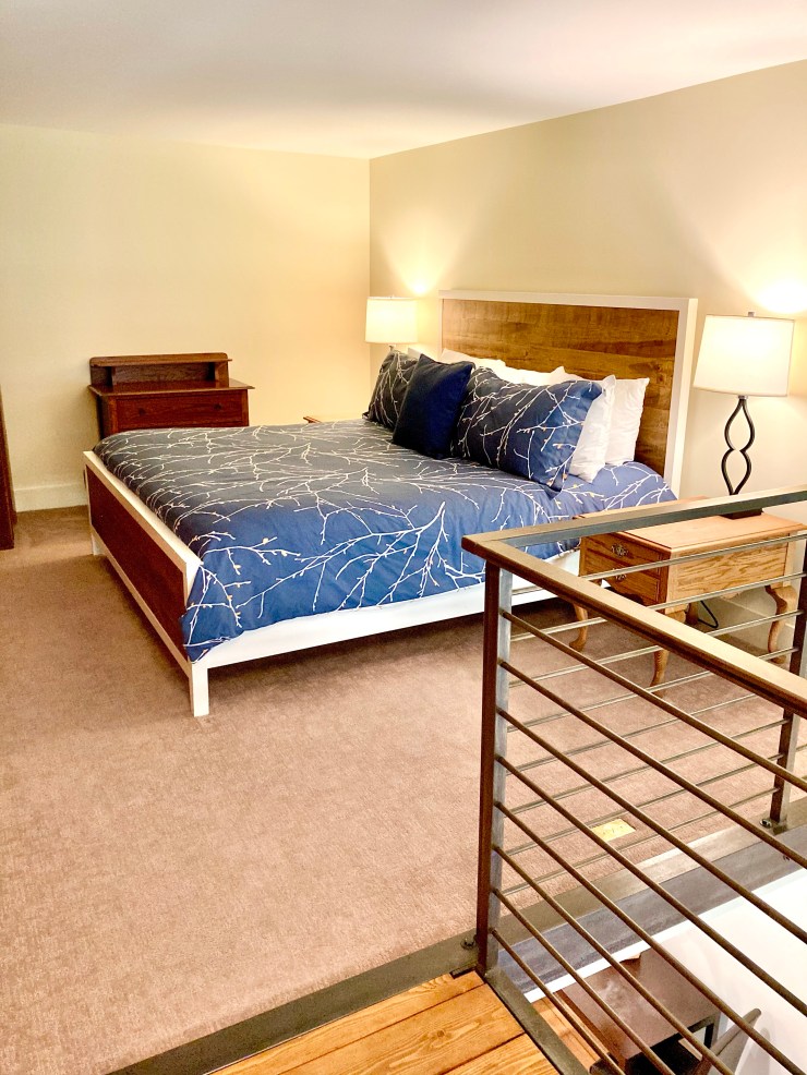Room 30: View Lofted Studio. 3rd Floor. Water View. King Bed. Stairs to Lofted Sleeping Area. TV Downstairs. Full Bath. Full Kitchen. Modern Decor. Will accommodate 4 people with air bed.