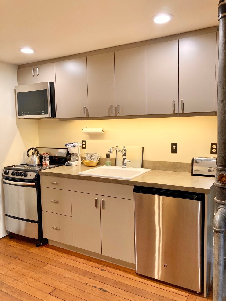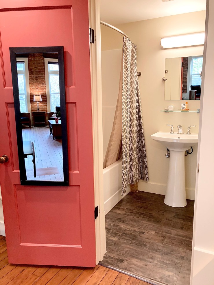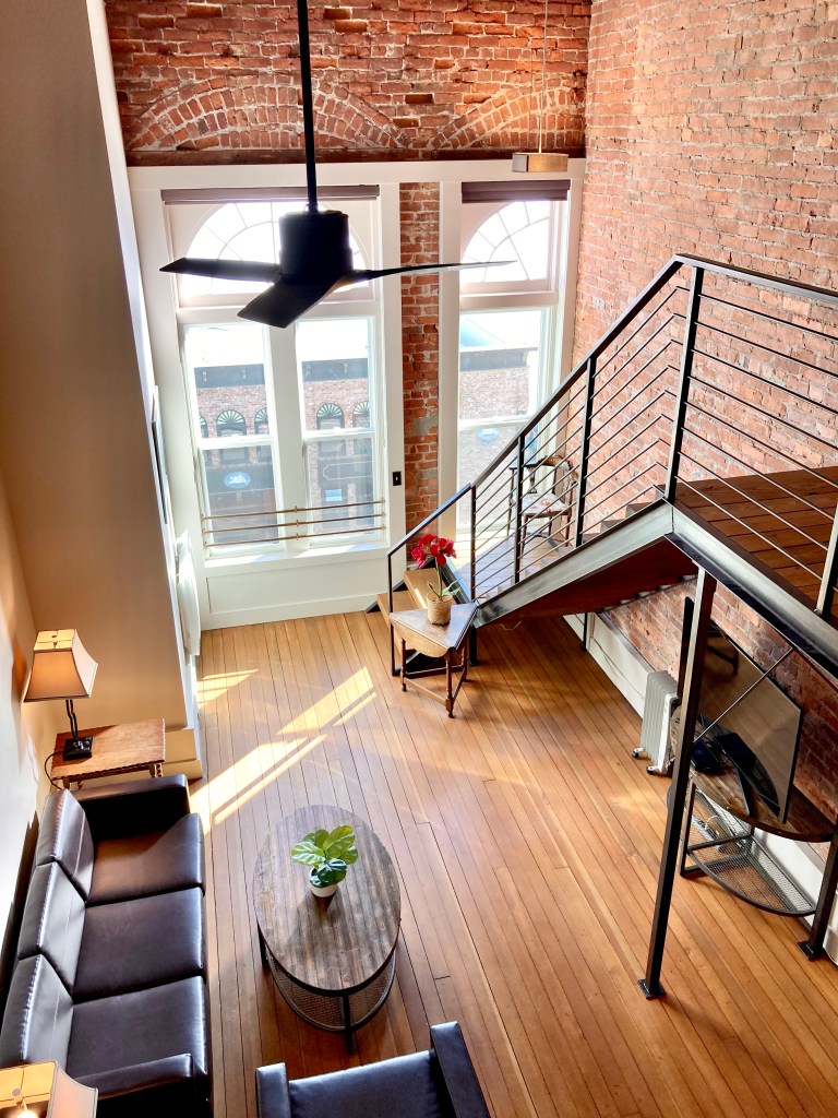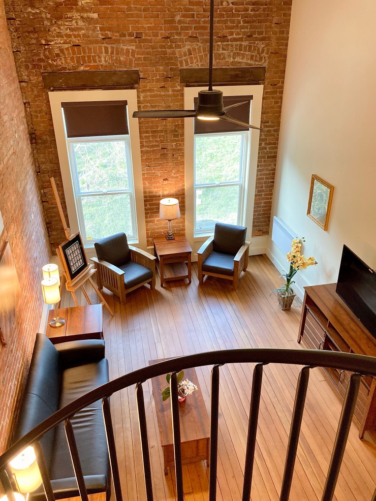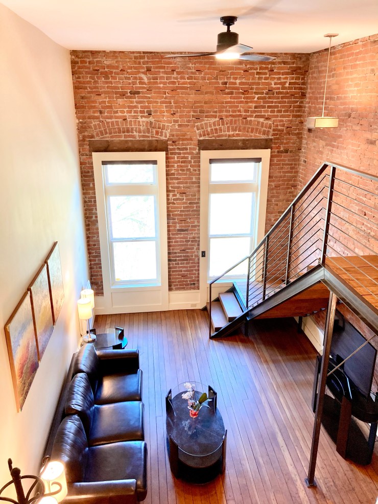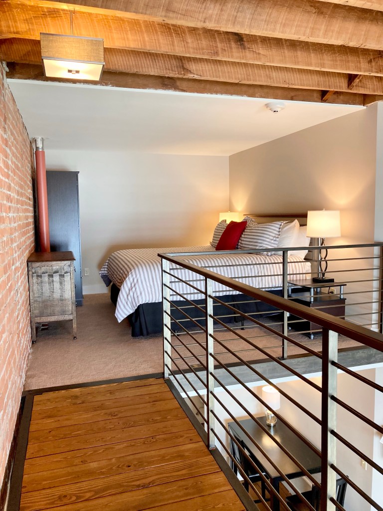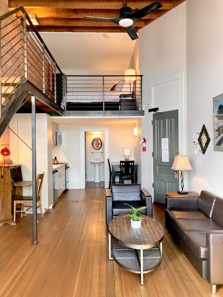 Room 32: Lofted Studio. 3rd Floor. Historic Bell Tower View. King Bed. Stairs to Lofted Sleeping Area. TV Downstairs. Full Bath. Full Kitchen. Modern Decor. Will accommodate 4 people with air bed.